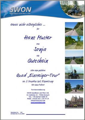 - Verschenken Sie Sie „Freude“ Mit einem „individuellen Geschenkgutschein“ für eine geführte Quadtour treffen Sie immer ins Schwarze! Alle Quad-Touren sind als individuell gestalteter Gutschein ohne Mehrkosten für den Versand erhältlich! Spaß und Vergnügen erleben Sie bei einer unserer geführten Quad Touren. Fahren Sie mit uns zu den schönsten Plätzen in der Region Kaiserstuhl, Tuniberg und im Elsaß und geniessen die bezaubernden Aussichten.